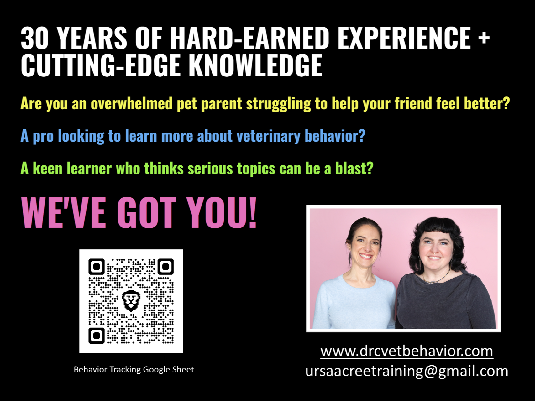 We’re a tiny team of people-loving, science-driven behavior geeks led by Dr. C. We help Amazing Pet People and their Complex Pets finally get the answers, support, and hope they’ve been searching for.